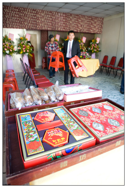 老公細心排列在喜餅店借來的木墭上